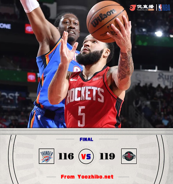 优直播讯北京时间12月2日讯 NBA常规赛,火箭主场迎战雷霆,西部第一和第二迎来直接交锋。比赛开始,双方开场便陷入缠斗,比分交替领先,火箭多点开花,雷霆里突外投给出回应,次节火箭将分差拉开到两位数,雷霆连中三分还以颜色,范弗里特连得8分,半场战罢火箭62-60领先2分。易边再战,两队依旧打得难解难分,雷霆持续发力打出9-0的攻击波完成反超,末节火箭扳平比分,此后双方争夺陷入白热化,范弗里特连中三分,华莱士三分给出回应,狄龙和亚历山大抢球引发冲突,但狄龙争得关键球权且命中压哨,火箭119-116雷霆险胜过关。