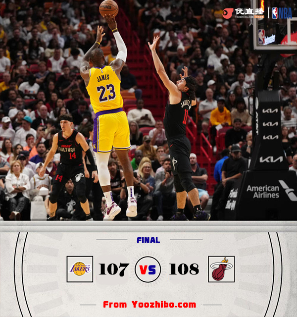 优直播11月7日讯 NBA常规赛,热火主场迎战湖人,热火本赛季开赛状态一般,目前2胜4负,而湖人则是由于伤病等原因拿到3胜3负的战绩。比赛开始,双方外线手感都不错展开对飚,阿德巴约成为热火主力得分点,而湖人得分点更多,连续反击逐渐取得领先,但热火以邓罗为首的替补接连发挥能给出回应,首节双方打平。次节詹姆斯接连杀篮下撑起球队进攻,双方展开拉锯战,热火全民皆兵建立领先,里夫斯也能送出补扣回应,半场热火领先3分。下半场,双方继续展开拉锯战,比分持续胶着,阿德巴约有攻有传联手巴特勒一波10-0建立主动权,三节结束热火领先11分,末节詹姆斯再送暴扣,湖人7-2迅速缩近比分,但哈克斯接连篮下打成再次稳住局势,拉塞尔抱怨裁判连续吃T直接被驱逐,伍德里突外投止血,但热火还是依靠硬解给出回应重新领先到双位数,伍德三分加詹姆斯强打2+1再次咬到1分,雷迪什关键三分不进,最终湖人惜败热火。