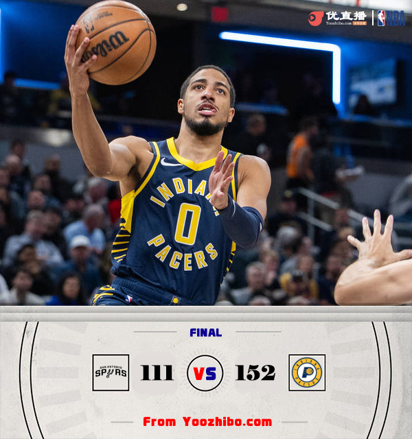 优直播11月7日讯 NBA常规赛,马刺客场挑战步行者。上半场,两队开场大打对攻,哈利伯顿和特纳联手拿分,首节后半段马刺哑火,托平扣篮引领球队19-5的进攻高潮确立优势,次节马刺里突外投努力追赶,步行者行云流水的进攻让马刺无力招架,半场战罢步行者86-61领先25分。下半场,步行者依旧攻势如潮,文班亚马连投带罚苦苦支撑,步行者火力全开轰出15-0的进攻高潮将分差拉开到30分以上,三节打完步行者轰下119分。末节步行者依旧火力不减,多点开花将分差拉开到40分以上,最终,步行者152-111大胜马刺。