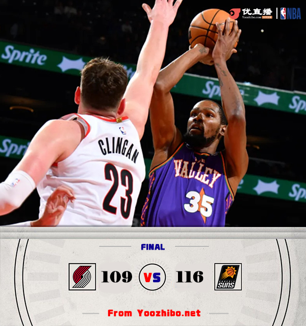 优直播讯北京时间12月16日讯 NBA常规赛,开拓者对阵太阳,开拓者近况不加遭遇5连败,太阳上场比赛在杜兰特复出的帮助下力克爵士。开场后布克三分先声夺人,随后杜兰特接连砍分帮助太阳建立领先,开拓者多点开花紧追不舍,但第一节尾声太阳外线又是一波三分将分差拉大到两位数。第二节上来开拓者内外开花一路将分差追到只差2分,克林根内线连续上演暴扣,布克和奥尼尔先后命中三分为太阳止血。易边再战,开拓者延续反扑势头,上来就是一波11-0的攻势反超比分,布克内突外投连连砍分帮助太阳夺回领先。第四节太阳多点开花再度掀起攻势将分差拉大到两位数,虽然开拓者最后时刻一度又缩小分差,但时间所剩无几,最终太阳116-109送开拓者6连败。