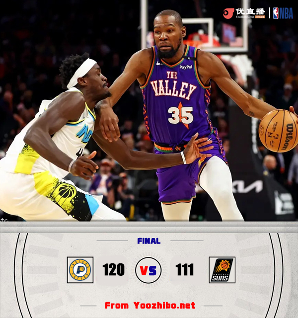 优直播讯 北京时间12月20日讯 NBA常规赛,太阳今日迎战步行者,两队近来状态都可以,均是取得两连胜,此役比尔可以出战,内史密斯缺战。比赛上来,太阳率先进入状态取得领先,但随后他们陷入到近四分钟的得分荒,步行者趁势轰出一波14-0的攻势完成反超,之后的比赛太阳虽然一直紧咬比分却始终无法重夺领先,半场结束时步行者仍领先1分;下半场回来,步行者重新找到节奏,进攻端势如破竹单节再轰37分,分差也是拉开到了十分以上,对于太阳更为不利的是布克因腹股沟伤势提前退赛,末节步行者也没有再给对手任何机会,即便是杜兰特连续砍分也无济于事,最终步行者轻取太阳,迎来三连胜的同时也终结了后者的连胜。