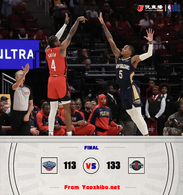 优直播讯 北京时间12月20日讯 NBA常规赛,火箭主场迎战鹈鹕,火箭目前17胜9负排在西部第3位,鹈鹕4连败后5胜22负西部垫底,本场比赛锡安和英格拉姆继续缺阵。比赛开始,火箭多点开花上来就发力,外线接连三分打出21-3超级攻击波一举奠定领先,除谢泼德外火箭首节出场球员皆有得分,火箭首节领先14分,次节双方展开对攻战,墨菲和穆雷有攻有传带队追分,但狄龙连中4记三分半场轰下20分给出回应,次节双方打成27平。下半场,杰伦-格林开始发力,接连冲击内线得分迅速上双,火箭顺势拉开20分以上领先,赫伯特-琼斯三分止血,随后杰伦-格林继续冲筐单节砍22分,三节火箭领先到20分,末节麦科勒姆接连造杀伤追分,但杰伦-格林再送暴扣回应,火箭牢牢掌握住十几分领先,最终火箭133-113轻取鹈鹕,送对手5连败。