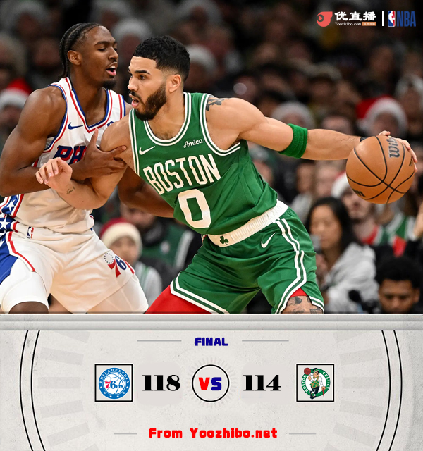 优直播讯12月26日NBA圣诞大战,凯尔特人主场迎战76人,凯尔特人目前22胜7负高居东部次席,76人则是10胜17负排在东部第12位。本场比赛,霍勒迪缺阵。比赛开始,双方上来就下起三分雨,马克西里突外投迅速上双,恩比德接连内线强打建立主动权,但绿军依然靠三分回应,首节76人领先5分,次节双方再次三分对飚,马克西有攻有传带队15-2攻击波扩大到双位数领先,塔图姆里突外投连砍9分带队追分,恩比德接连中远投强势回应8分,半场76人还领先8分。下半场,双探花联手7-0追分,随后76人进攻端受阻,杰伦-布朗里突外投单节砍下14分助队直接反超比分,三节双方打成82平,末节马克西里突外投加助攻凯莱布-马丁三分,带领76人轰出18-2重新取得领先,塔图姆带队连续强杀回应11-0咬住比分,恩比德联手马克西止血,76人重新领先到两球以上,乔治和恩比德两罚全中杀死比赛,最终76人118-114力克凯尔特人。