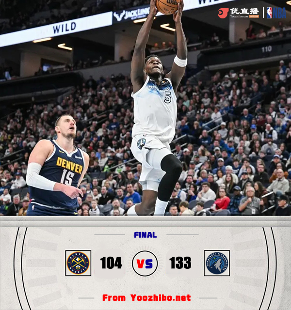 优直播讯 北京时间1月26日讯 NBA常规赛,森林狼主场迎战掘金,森林狼目前23胜21负西部第8位,掘金则是近4连胜后28胜16负西部第4位。比赛开始,戈贝尔上来很是兴奋,进攻端连续强打加送妙传带队建立主动权,随后约基奇里突外投单节13分带队止血,但森林狼多点开花首节轰下40分领先9分,次节小乔丹接连前场篮板,穆雷和威少联手追分,森林狼还是能多人回应半场领先双位数。下半场,掘金防守端依然提不起劲儿,爱德华兹里突外投单节轰下16分,森林狼继续多点开花领先到20分以上,末节掘金进攻端断电,打了5分钟仅得2分,森林狼牢牢保持住20分以上领先,最终森林狼133-104大胜掘金,终结对手4连胜。