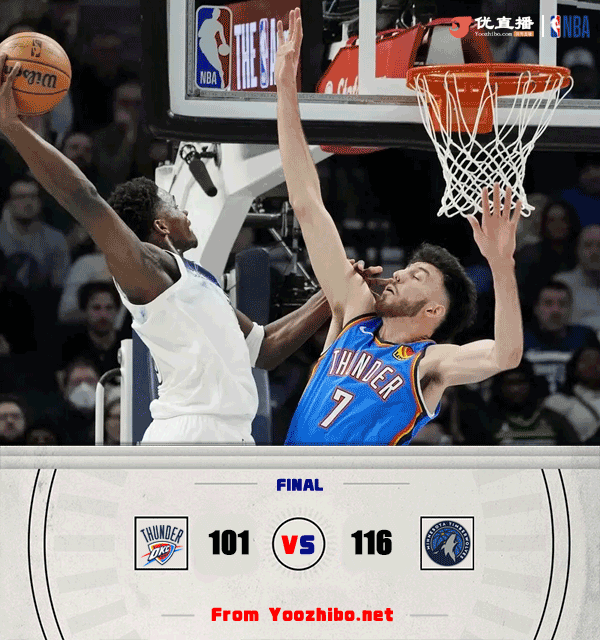 优直播讯2月14日NBA常规赛,森林狼主场迎战雷霆。两队皆是背靠背,森林狼2连败后30胜25负排在西部第7位,雷霆则是豪取7连胜,44胜9负高居联盟榜首。本场比赛,森林狼戈贝尔和康利缺阵;雷霆卡鲁索也不打。比赛开始,亚历山大不在状态连续打铁,雷霆进攻端也受阻,而森林狼则是活力十足,爱德华兹送暴力隔扣,香农也成为奇兵,首节森林狼领先13分,次节双方展开拉锯战,杰伦威接连突破单节上双带队追分,但里德能给出回应,香农压哨勾手命中助森林狼半场还领先8分。第三节,雷霆上来就接连攻击内线一度反超比分,但沃克和里德、爱德华兹接连4记三分轰出12-0攻击波强势回应,随后双方拉锯战三节森林狼还领先10分,末节森林狼接连攻击内线一波10-2再次拉开比分,随后森林狼牢牢保持住十几分领先,双方换上替补练兵,最终森林狼116-101力克雷霆,终结对手7连胜。