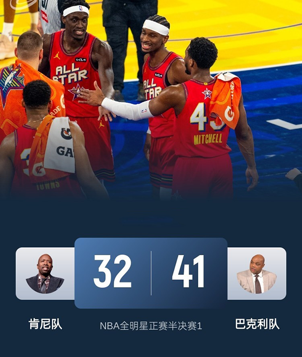 优直播讯北京时间2月17日讯 NBA全明星正赛首场半决赛,肯尼队对阵巴克利队。肯尼队有爱德华兹、布伦森、贾伦-杰克逊、杰伦威、加兰、莫布里、康宁汉姆、希罗;巴克利队有约基奇、特雷-杨、亚历山大、文班亚马、西亚卡姆、申京、唐斯、米切尔。比赛开始,莫布里连续暴扣,巴克利队内外开花给出回应,唐斯和希罗对飙三分,肯尼队连中三分轰出11-2的攻击波占据主动,文班亚马暴扣引领巴克利队11-4的小高潮强势回应,亚历山大内外开花连得5分率队晋级决赛。最终,巴克利队41-32击败肯尼队。