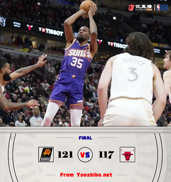 优直播讯北京时间2月23日讯 NBA常规赛,公牛主场迎战太阳,公牛5连败后22胜34负东部第10,太阳4连败后26胜29负西部第11。比赛开始,太阳很慢热打了3分多钟才通过罚球拿到首分,半节多得分还未上双,公牛9-2开局后接连三分建立主动权,首节领先10分,次节双方展开拉锯战,公牛全民皆兵保持领先,但太阳三巨头轮番发力,助队单节轰出40分半场反超2分。下半场,布克继续发力里突外投单节轰下14分,比尔也接连突破取分领先到双位数,但公牛接连3记三分三节还是追到差3分,末节太阳上来7-0再次领先双位数,但公牛外线发炮还能咬住比分,怀特2+1直接追平,杜兰特接连罚球,布克三分再进,布克接连不讲理三分杀死比赛,最终太阳121-117力克公牛,终止4连败同时送对手6连败。