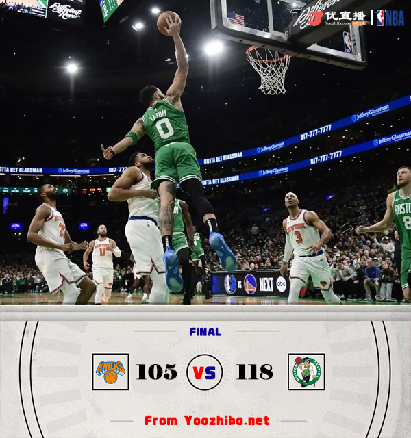 优直播讯北京时间2月24日讯 NBA常规赛,凯尔特人主场迎战尼克斯,凯尔特人4连胜后40胜16负稳居东部次席,尼克斯则是37胜19负排在东部第3位。本场比赛,哈特迎来复出。比赛开始,绿军先发五虎都得分带队打出13-3不错开局,哈特和布伦森接连单打止血,但豪泽连续外线发炮,塔图姆接连突破还是领先到19分,次节佩恩连砍7分助队10-2迅速追分,波尔津吉斯攻防建功助队稳住局势,塔图姆干拔三分再中助绿军半场领先21分。下半场,唐斯反弹里突外投得分迅速上双,但双探花外线能回应,布伦森连砍12分助队打出23-5攻击波一度追到个位数分差,末节怀特接连三分助队稳住局势,唐斯受伤好在无碍,杰伦-布朗发力连砍11分带队重新拉开20分领先,最终凯尔特人118-105击退尼克斯,拿到5连胜。