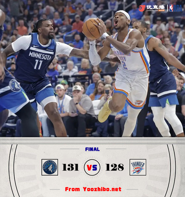优直播讯北京时间2月25日讯 NBA常规赛,雷霆坐镇主场再战森林狼。雷霆46胜10负联盟第一,森林狼31胜27负。上一场比赛,雷霆客场力克森林狼。比赛开始,双方开场势均力敌,比分始终紧咬,森林狼多点开花,雷霆里突外投强势回应,次节森林狼命中率下降,雷霆趁势将分差拉开到两位数,森林狼仍无起色,半场战罢雷霆64-45领先森林狼。易边再战,两队大打对攻,雷霆保持着20分左右的优势,末节森林狼不断冲击篮筐连投带罚苦苦追赶,爱德华兹被换下,森林狼轰出16-0攻击波第四节单节41-19净胜森林狼22分将比赛拖入加时。加时赛,双方继续缠斗,比分交替领先,爱德华兹重新披挂上阵,里德补篮造杀伤两罚全中带队重获1分优势,爱德华兹血帽亚历山大,沃克两罚全中,亚历山大绝平三分没有,最终,森林狼加时131-128逆转雷霆。
