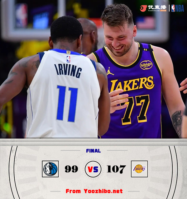 优直播讯 北京时间2月26日讯 NBA常规赛焦点战,湖人主场迎战独行侠。这是东契奇和浓眉重磅交易后两队首次交锋,可惜浓眉本场因伤缺阵。湖人34胜21负西部第4,独行侠31胜27负西部第8。比赛开始,湖人率先发力打出9-2开局,欧文和东契奇接连外线对飚,随后里夫斯和八村塁又是接连三分命中,首节湖人领先8分,次节双方展开拉锯战,里夫斯接连三分单节得分上双,东契奇接连送助攻一度拉开16分领先,但湖人收内线策略效果不佳,克里斯蒂接连三分助独行侠半场追到差8分。下半场,双方展开拉锯战,湖人外线多个机会把握不住,欧文连砍7分继续带队追分,埃克萨姆接连中远投砍下5分追到差1分,末节克莱连续3记三分追平比分,东契奇上场和一攻一传助队稳住局势,欧文三分再追,但芬尼-史密斯和詹姆斯接连送补扣,湖人牢牢掌握住两球以上领先,最终湖人107-99力克独行侠,拿到3连胜。