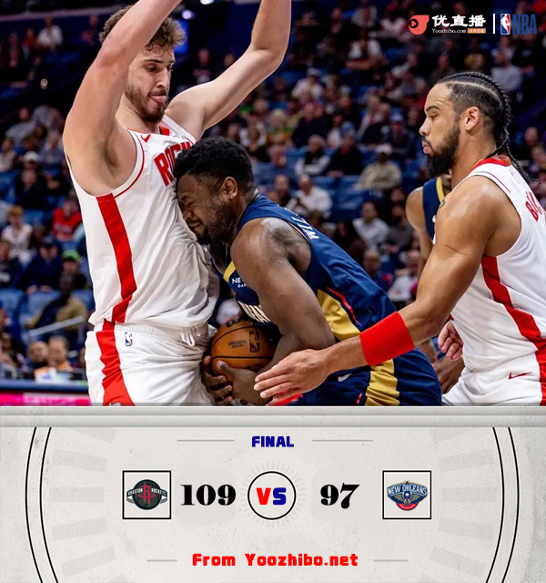 优直播讯北京时间3月7日讯 NBA常规赛激战正酣,火箭和鹈鹕两支青年军正面对话,火箭遭遇3连败战绩来到37胜25负,暂列西部第5位,鹈鹕17胜45负排在西部倒数第二。首节开打后墨菲连拿7分率队占优,火箭内外结合及时回应,但墨菲无人可挡单节狂揽15分,鹈鹕领先3分结束首节争夺,次节回来,火箭始终无法打出追分高潮,鹈鹕稳扎稳打保持优势,半场战罢,鹈鹕依然领先3分。易边再战后鹈鹕进攻停滞,申京和杰伦-格林轮番冲击,末段鹈鹕进攻依然毫无起色,火箭顺势拉开比分,三节结束后火箭确立15分优势,末节上来,锡安连造杀伤率队追分,但火箭总能给予回应,最终火箭109-97击败对手,终结3连败的同时也终结客场8连败。