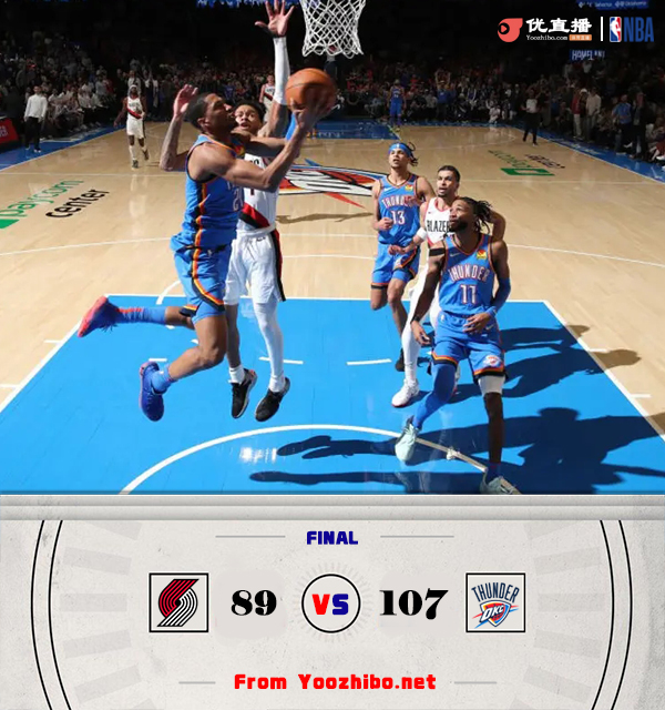 优直播讯北京时间3月8日讯 NBA常规赛,雷霆对阵开拓者,雷霆最近5连胜依旧在西部遥遥领先,本场比赛亚历山大、杰伦威和霍姆格伦都缺阵,开拓者上场比赛遭遇失利,还是排在西部第十二。开场后雷霆外线手感不错频频命中三分,在第一节中段他们打出攻势取得领先,随后开拓者也用三分回击缩小分差。第二节上来西蒙斯率先发力带领开拓者反超比分,雷霆通过加强防守多次造成开拓者失误打出反击,并且外线续上火力重新夺回领先,第二节尾声开拓者陷入得分荒,半场过后雷霆领先到18分。易边再战,雷霆上来延续攻势将分差拉大到20分开外,亨德森突然爆发带领开拓者一路追到只差5分。第四节雷霆及时稳住局面,两队围绕10分拉锯,开拓始终无法追上比分,最终雷霆107-89击败开拓者取得6连胜,开拓者遭遇2连败。