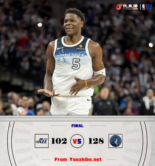 优直播讯北京时间3月17日讯 NBA常规赛,森林狼主场迎战爵士。森林狼目前7连胜,39胜29负排在西部第7位;爵士则是8连败后15胜52负西部垫底。本场比赛,康利不打。比赛开始,爱德华兹状态出色,里突外投连砍10分带队轰出17-5不错开局,马尔卡宁接连三分止血,爱德华兹进攻挡不住单节轰下21分带队首节领先14分,次节爵士上来12-2直接咬住比分,森林狼迅速调整,多点开花回应12-2稳住领先优势,半场森林狼还领先11分。第三节,塞克斯顿带队追分,但爱德华兹再次发力,单节又轰下16分,森林狼直接拉开20分以上领先,末节森林狼换上替补练兵,克拉克攻防带队拉开30分以上领先,爵士无力回天,最终森林狼128-102大胜爵士,豪取8连胜同时送对手9连败。