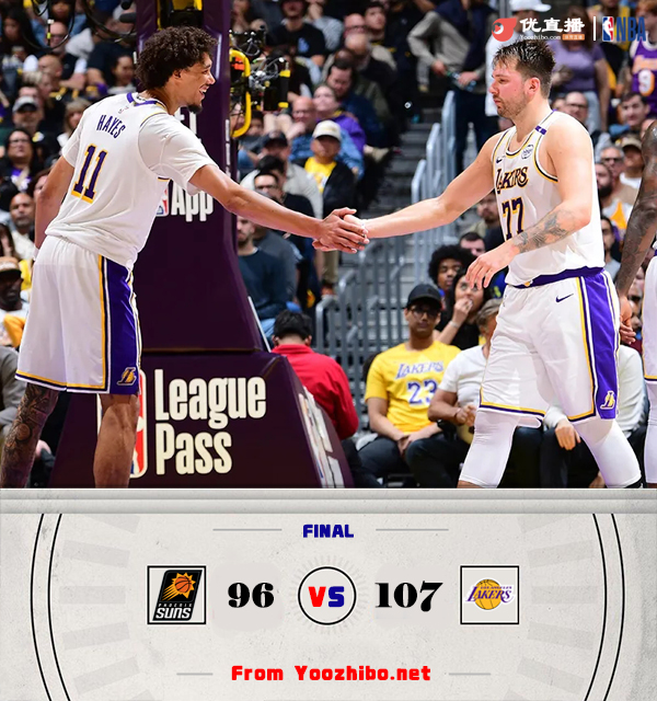 优直播讯3月17日NBA常规赛,湖人主场迎战太阳。湖人已经经历4连败,目前40胜25负西部第5位;太阳则是31胜36负西部第11位。本场比赛是湖人5天4赛中的第3场比赛,海斯、芬尼-史密斯迎来复出;詹姆斯继续缺阵。比赛开始,湖人上来打出7-0不错开局,太阳迅速回应9-1反超,随后东契奇连续外线发炮带队建立主动权,文森特三分再中一度拉开20分领先,次节双方展开拉锯战,太阳三巨头状态不佳,外线颗粒无收,里夫斯接连中远投命中,海斯继续吃饼,半场湖人还领先17分。下半场,比尔因腿筋伤退,杜兰特连续中远投砍下8分带队一度追到个位数分差,东契奇又是送妙传止血后连续杀伤内线稳住领先优势,三节湖人还领先12分,末节双方命中率都有下降,里夫斯3+1后东契奇再打2+1帮助湖人牢牢守住双位数领先,最终湖人107-96击退太阳,终止4连败。