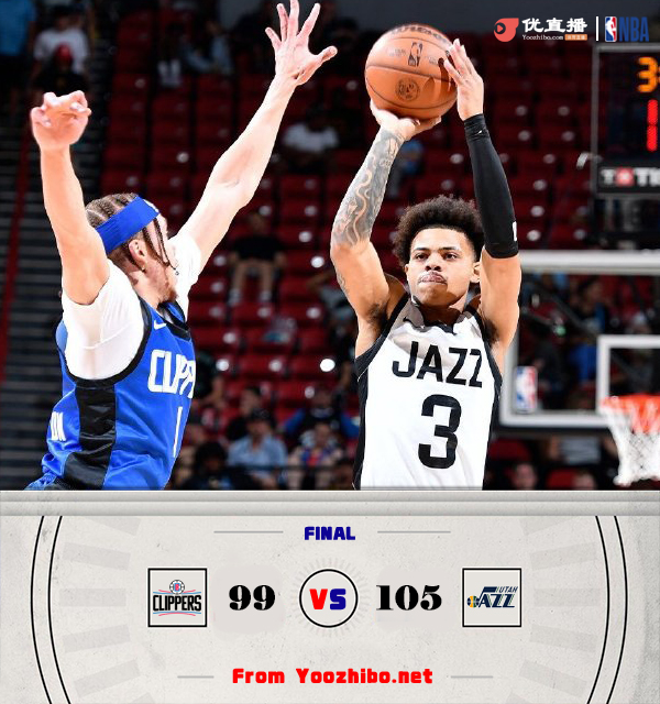 优直播7月9日讯 拉维斯加斯夏季联赛继续进行,快船和爵士直接交锋,爵士这边阿巴基和朱赞领衔,今年的16号秀基昂特-乔治继续出战,快船这边普雷斯顿领衔,今年的30号秀科比-布朗和48号秀乔丹-米勒在列。比赛开始后快船率先发力,普雷斯顿联手迪亚巴特轮番取分,爵士连中三分强势回应,中段两队外线火热对飚,爵士多点开花逐渐拉开比分,首节结束时爵士领先7分,次节回来,两队进攻火力放缓,快船始终无法打出追分高潮,中段爵士外线续上火力继续扩大优势,半场战罢,爵士继续领先10分。易边再战后普雷斯顿率队追分,阿巴基内外结合立刻回应,乔治接连取分,三节结束后爵士依然保有6分优势,末节决战,乔治无人可挡连中三分,单节狂揽17分,阿巴基里突外投继续取分,两人联手率队再次确立两位数优势,末段穆恩连中三分,但无奈追分未果,最终爵士105-99击败快船。
