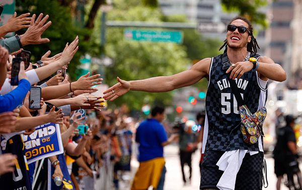 新秀布劳恩也是这次总决赛的亮点,他打得一点儿也不像是新秀,关键时刻非常强硬。在游行中接受完采访,布劳恩向球迷发起冲刺,一口气与多人击掌互动,年轻人兴奋起来了。