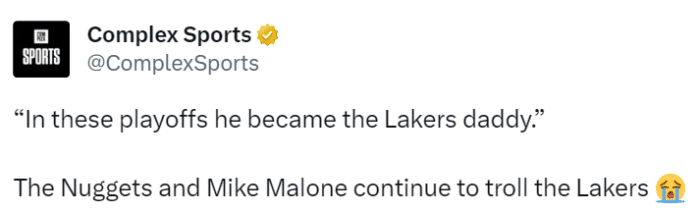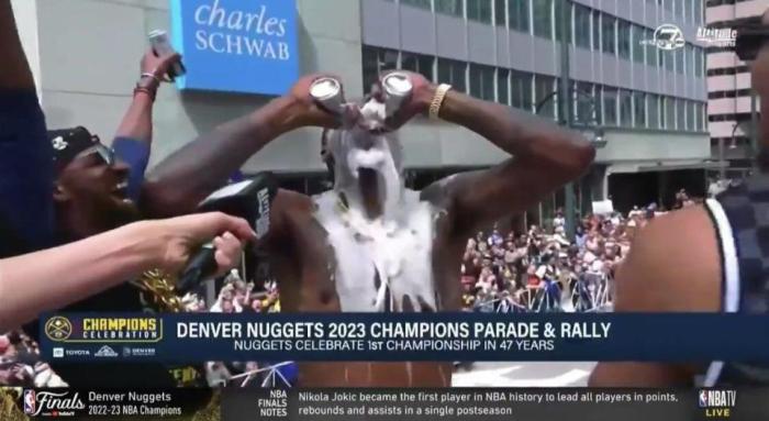 马龙还在游行中对着球迷狂喷香槟,作为一名教练,他的表现相当狂野,富有激情。被美媒疯狂转发的一幕,是掘金主持人在夺冠庆典上介绍马龙的一番话:“他来到这个世界上时,是一位教练的儿子,但在这些季后赛中,他成为了湖人队的爸爸。”在西决中,掘金横扫了湖人,晋级总决赛。