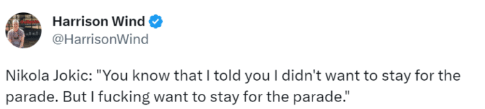 约基奇上台后,也立马对自己此前的言论进行改口:“你们知道我告诉过你们,我不想留下来参加游行,但我现在TMD就想留在这个游行中。人们的欢呼声是最棒的,这种感觉太美妙了。这是我们一生中都会铭记的时刻。看到你们在街上欢呼我很开心。我们爱你们。丹佛,这个冠军是为你赢下的!”