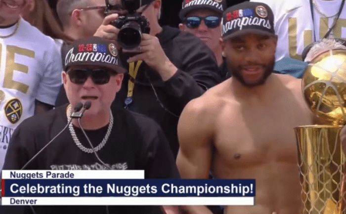 优直播讯 北京时间6月16日,拿下队史首冠的掘金队,在丹佛举办了盛大的夺冠游行。约基奇带着总冠军奖杯、FMVP奖杯现身,与他的队友一起和球迷们分享夺冠的喜悦。在这次夺冠游行中,亮点不断——
