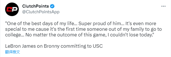 詹姆斯还在社媒上祝贺布朗尼:我真为你感到骄傲,孩子!除了我爱你@布朗尼我不知道该说啥!!加油哇!