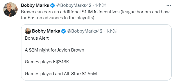 杰伦-布朗轻松打卡下班,本赛季第65次出战,从而获得51.8万美元的奖金;此前因入选全明星阵容,布朗获得155万美元;在季后赛中,布朗还有望再拿到110万美元的奖金。