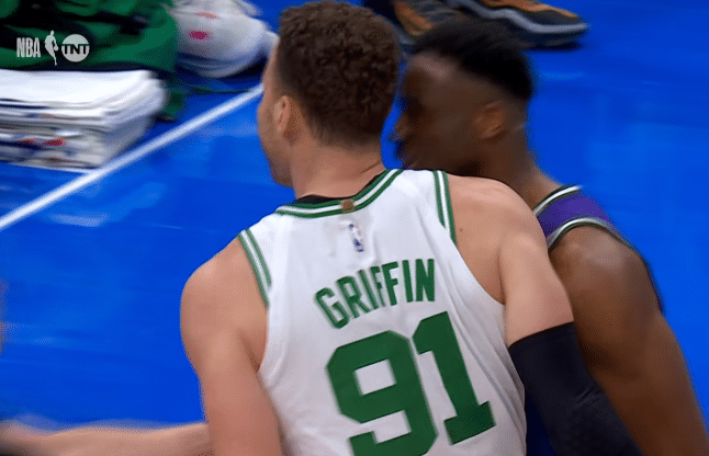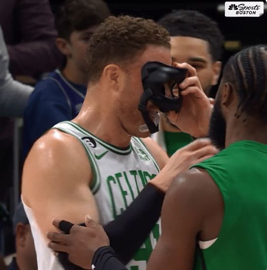 值得一提的是,格里芬的头被撞之后,凯尔特人替补席附近十分欢快,杰伦-布朗直接把他的面具借给格里芬,如此画面太有趣。