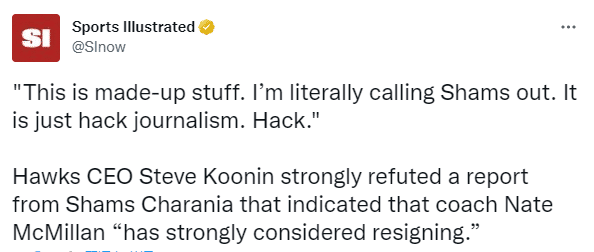 来源:优直播12-31 17:14优直播12月31日讯 ,名记shams爆料,亚特兰大老鹰主教练麦克米兰正在强烈考虑辞职,对于这样的辞职流言,老鹰主帅正式回应,目标带领老鹰冲击季后赛,赛季结束后考虑退役。