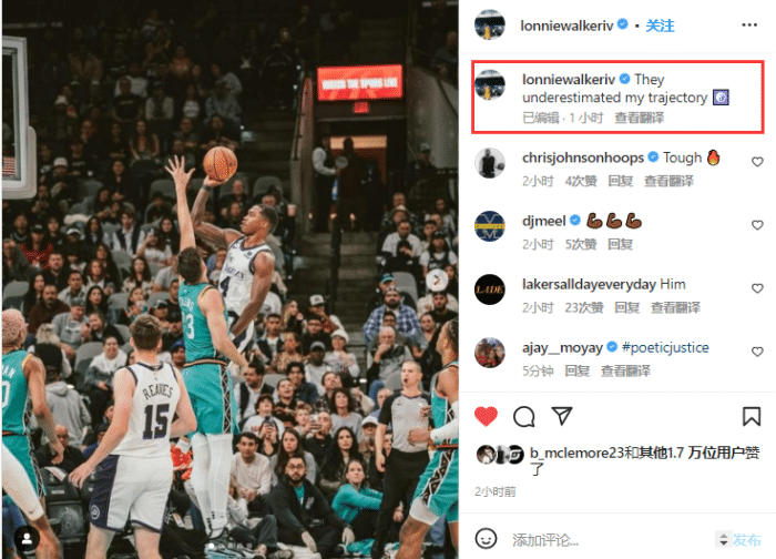 来源:优直播11-28 13:42优直播11月28日,湖人球员朗尼-沃克更新社交媒体,在Ins上晒出多张对阵旧主马刺的赛场照,并且配文写道:他们低估了我的发展轨迹。沃克还透露詹姆斯39分11篮板大爆发的真因,湖人记者猜测是兰福德激怒了老詹。