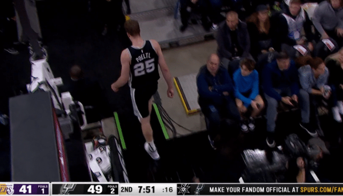 第二节马刺打出精彩的配合,铂尔特尔中路空切直接上演劲爆的单臂滑翔暴扣,可铂尔特尔落地时不幸受伤,表情痛苦并且一瘸一拐下场,马刺立即换人,铂尔特尔则返回更衣室接受检查,因伤提前退出比赛。