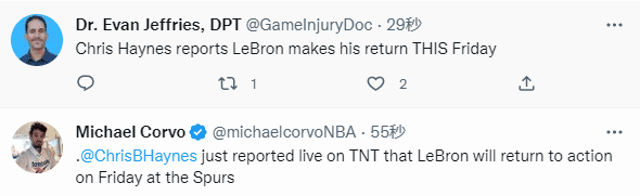来源:优直播11-23 20:40优直播11月23日,詹姆斯因左内收肌拉伤继续休战,缺战湖人与太阳的比赛,比赛期间,名记克里斯-海耶斯报道,詹姆斯将在本周六复出对阵马刺。