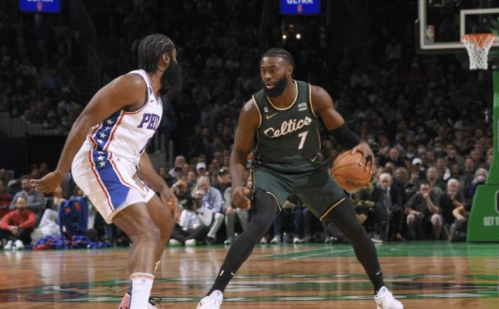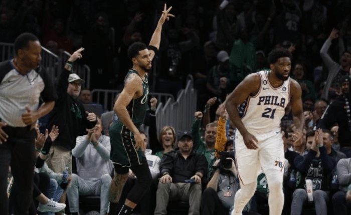 下半场,第三节开场不到1分钟场上发生冲突,斯玛特不满被恩比德夹手臂,伸手拽倒恩比德引冲突,恩比德和布朗互喷纠缠,哈登第一时间劝架,此时绿军全场球迷怒骂恩比德;第三节哈登的状态依旧很好,突破抛投以及晃倒塔图姆(可惜投篮又没进),单节又拿到9分,可76人防守太糟糕,再加上塔图姆单节17分,费城落后到两位数。
