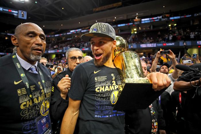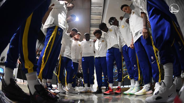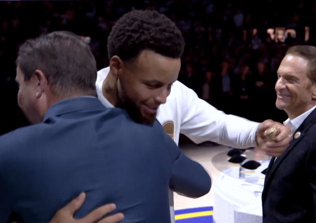 赛前勇士全队正式领取冠军戒指,勇士老板率先领取戒指,之后迈尔斯和汤普森、库里发表讲话,汤普森表示库里是NBA史上最伟大的射手,库里谦虚直言还不是,库里上场后全场球迷高呼MVP。