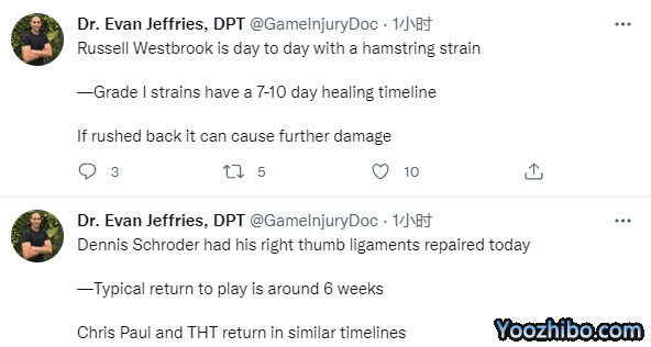 Evan Jeffries还表示威少因腿筋拉伤被列入每日观察名单,腿筋一级拉伤一般需要7-10天的康复期,若急于复出可能导致伤情加重。