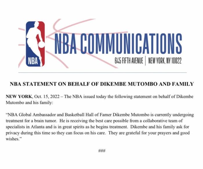 NBA官方声明:穆托姆博正在亚特兰大接受脑瘤治疗,他的精神状态很好,他和他的家人要求在这段时间保持隐私,这样他们可以集中精力照顾他。感谢你们的祝福和祈祷。