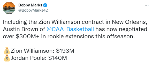 未来5年,普尔继续为勇士效力,而22-23赛季是普尔新秀合同的最后一年,年薪是390万美元;不过等到这份新合同到期,普尔生涯总薪水将会达到1.5亿美元。