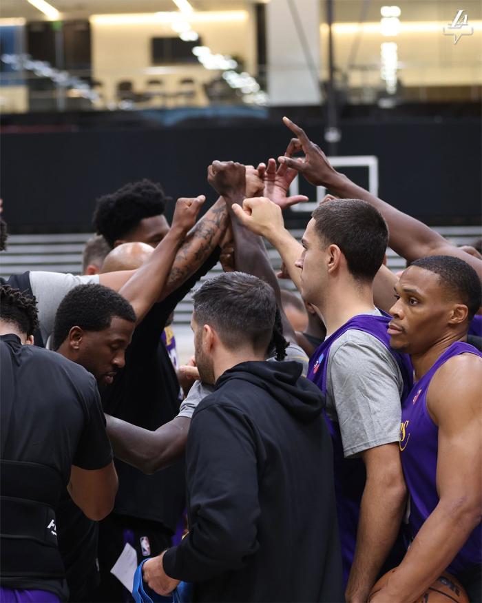来源:优直播09-28 10:51优直播09月28日,洛杉矶湖人队正式举办训练营,首日训练之后湖人官方晒出训练照,配文写道:训练营第一天;浓眉单挑詹姆斯,两大巨头的表情抢镜;威少抱球目视远方,加布里埃尔满脸笑容,训练之后众球员围在一起击拳加油。