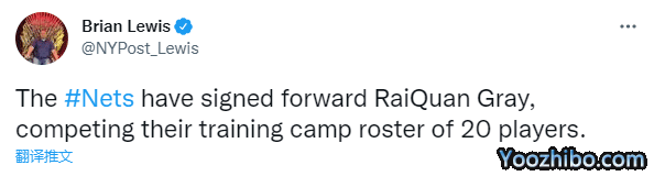 来源:优直播09-27 15:34优直播09月27日,据名记Brian Lewis报道,篮网已经签下前锋雷匡-格雷,双方签下一份训练营合同;篮网训练营20人大名单出炉,杜兰特、欧文和西蒙斯新三巨头领衔15+2冲冠阵容。