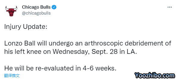 来源:优直播09-22 10:22优直播09月22日,芝加哥公牛官方宣布,球队后卫朗佐-鲍尔将于北京时间9月29日在洛杉矶接受左膝关节镜清创手术,将在4-6周内重新接受评估,这意味着鲍尔至少再伤停4-6周,将缺席新赛季训练营和季前赛,暂无复出时间表。