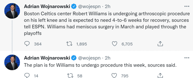 来源:优直播09-21 12:02优直播09月21日,据名记Woj报道,消息人士透露,波士顿凯尔特人的中锋罗伯特-威廉姆斯三世将在本周接受左膝关节镜手术,他预计需要4-6周的时间康复。绿军再次受到伤病打击,此前,绿军新援加里纳利因伤赛季报销。