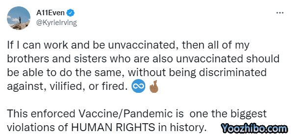 欧文发推写道:如果我不接种疫苗可以工作,那么我所有未接种疫苗的兄弟姐妹们都应该这么做,而不是受到歧视、诽谤或解雇。这种强制的疫苗是历史上最侵犯人权的行为之一。