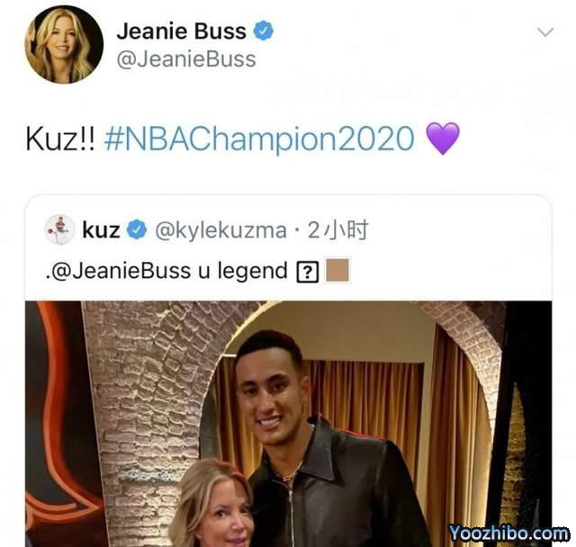 来源:优直播09-18 15:22优直播09月18日众所周知湖人是目前NBA市值排名前几的球队,但湖人的现任老板珍妮-巴斯却是NBA这么多老板中资产倒数前几的人,那是因为巴斯家族只对湖人拥有运营权,而真正股份却很少。不过这并不影响珍妮阿姨在球迷们心中的地位,近日珍妮阿姨也是更新了自己的社交媒体动态,她转发了前湖人球员库兹马的一条动态,而动态的内容就是他们两人相拥在一起的合照。珍妮还配文:库兹马!2020年总冠军。