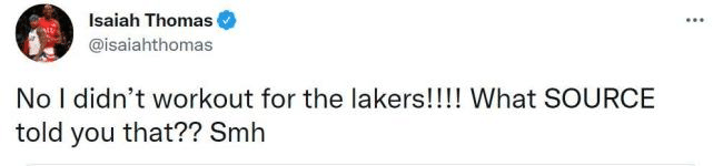 来源:优直播09-18 11:00优直播09月18日据NBA名记Michael Scotto报道,湖人试训了多位自由球员,其中包括沙巴兹-穆罕默德、杰里米-兰姆、德维恩-培根、米耶-奥尼、小托马斯、阿莫尼-布鲁克斯、沙里夫-库珀和米查尔-穆尔德。毫无疑问,两届全明星小托马斯是名气最大的球员,穆尔德是勇士旧将,兰姆的实力也很出色。小托马斯第一时间辟谣,表示自己并未为湖人试训。他写道:“不,我没有为湖人试训!!!哪个消息源告诉你的?”
