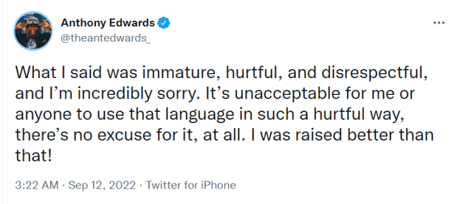 来源:优直播09-12 15:55优直播09月12日,森林狼新星爱德华兹更新社媒,为自己的不当言论正式道歉。此前,他曾在IG故事中分享了一段视频,视频中包含有反同性恋言论和种族歧视言论。美媒认为他将被联盟罚款或者停赛。