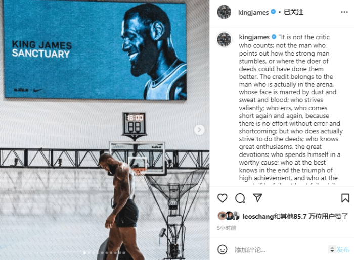 詹姆斯配文写道:荣誉不属于批评者,不属于那些指出强者如何跌倒、或实干者哪里本可以做得更好的人。荣誉属于真正站在竞技场上的人,属于脸庞沾满灰尘、汗水和鲜血的人,属于顽强奋斗的人,属于犯错,一次又一次失败的人,因为没有不伴随错误或缺陷的成就。然而实际拼搏的人,懂得极大热情和投入的人,投身于有价值的事业的人,最终或如愿取得伟大成就,而即使遭遇失败也不乏胆量,因此其所处将永不同于冷漠且胆小、未经胜败洗礼者。
