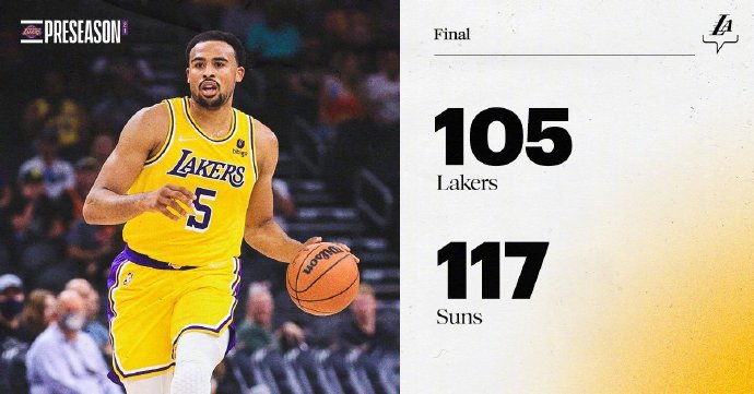 来源:优直播10-07 09:24 北京时间10月7日,2021-22赛季NBA季前赛继续进行,菲尼克斯太阳队迎战洛杉矶湖人队。最终,太阳队以117-105战胜湖人队。