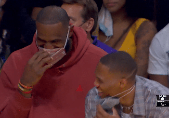 在裁判回放争议一幕时,哈登走上球场,双手抄兜和霍华德发生口角,最终霍华德被追加一次技犯;霍华德六犯下场时,他无奈地笑了,和小乔丹拥抱之后坐回替补席,此时镜头给到詹姆斯和威少,他俩坐在场边吃瓜并且捂嘴大笑。