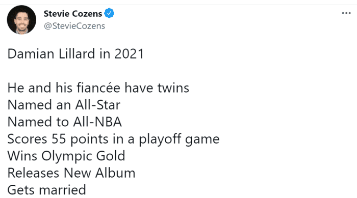 怎么样?看完利拉德2021年的履历后,你是不是很难不认同利拉德是NBA今年最大的赢家。球场上破纪录、拿金牌,球场下娶妻、出专辑、收获龙凤胎,他不仅仅是篮球场上的赢家,更是生活的大赢家。