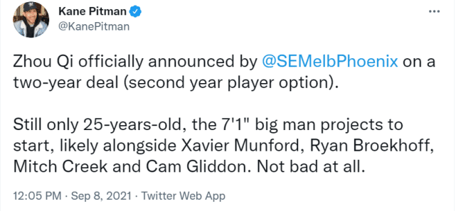 来源:优直播09-08 19:25优直播9月08日讯,澳大利亚篮球记者Kane Pitman报道称,周琦和墨尔本凤凰签下了1+1的合同,第二年为球员选项。Kane Pitman采访NBL联赛多年,是ESPN澳洲站的篮球记者。他预测了凤凰队新赛季的首发阵容,新援周琦在列,另外四位是芒福德、布勒克霍夫、克里克和格利登。除了格利登,包括周琦在内的其他四位预测首发都曾在NBA效力。