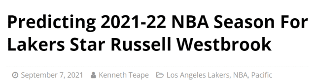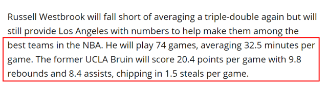 来源:优直播09-08 19:23优直播9月08日讯湖人新赛季的阵容有很大变化,威少是最受关注的一张新面孔。2021-22赛季,他能在湖人打出怎样的数据呢?北京时间9月8日, 美媒nbaanalysis给出了他们的预测——