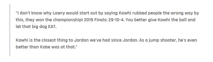 优直播9月07日讯几天前,热火球员洛瑞参加一档播客节目,谈到了猛龙夺冠那个赛季的一些细节,对于伦纳德,洛瑞表示:“他的一些做法惹恼了队友,他会对别人说‘把球给我,我会把事情办好’。”当然,洛瑞他自己承认,虽然数据方面有所下降,但是球队最终捧起总冠军奖杯,伦纳德起到了决定性作用。日前,美名嘴斯基普贝勒斯在自己最新一档节目中强调:伦纳德是乔丹之后,NBA这几十年时间里最接近乔丹的球员,作为一名投手,他甚至比科比还要出色!